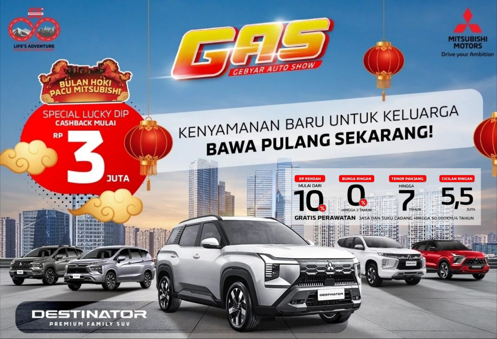 Destinator: Dp mulai dari 15% atau bunga 0% 1 tahun tenor panjang hingga 6 tahun , Free service sampai dengan 60.000km atau 4 tahun, Free Waranty sampai dengan 120.000km atau 4 tahun.