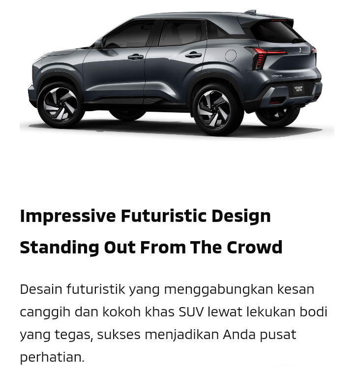 Desain futuristik yang menggabungkan kesan canggih dan kokoh khas SUV lewat lekukan bodi yang tegas, sukses menjadikan Anda pusat perhatian.
